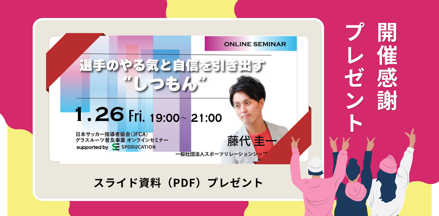 先日は、とても学びのあるセミナーを開催いただきありがとうございました。 私は高校で教員をしていますが、サッカーの場面だけではなく、教科指導、学級経営にも活かしていきたいと思います。 ありがとうございました。 |